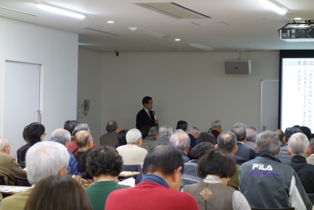 第3回の高麗浪漫学会会長の高橋一夫氏は、高麗郡建郡の目的を説明する複数の考え方の紹介や、自らが発掘した女影廃寺からわかる歴史的考察を話した。女影廃寺から出土した瓦の形から、同じ木型で作った瓦が類推できることなどを説明、瓦の考古学的な価値が再認識させられた。