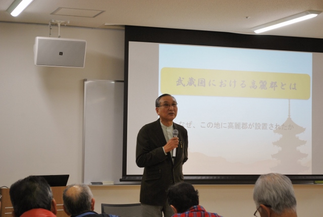 第1回の高麗神社宮司の高麗文康氏は、高麗郡建郡の時代の朝鮮半島、日本の状況をわかり易く説明し、その後の高麗郡の状況を、高麗王若光と高麗福信の話を冗談を交え語った。