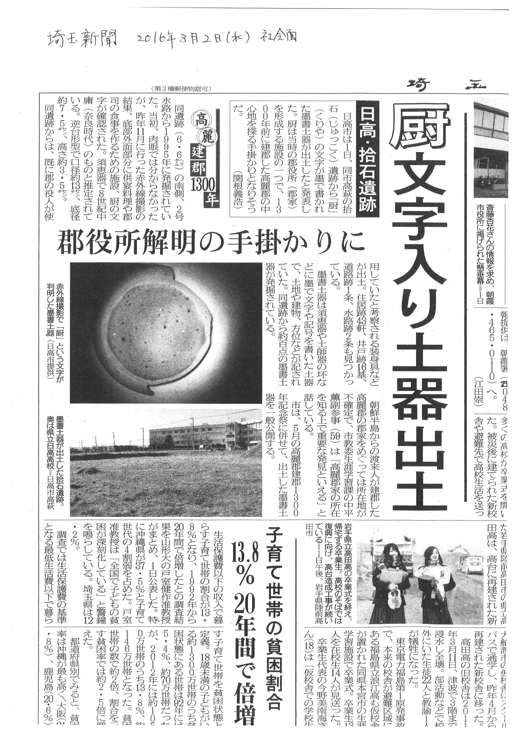 【メディア】「日高・拾石遺跡」 が、埼玉新聞(3月2日付)で紹介されました。 2016/03/04 日高・拾石遺跡の記事が、埼玉新聞・2016年3月2日付社会面に掲載されました。 記事はこちら(PDF)・・・埼玉新聞 2016年3月2日㊌掲載記事 埼玉新聞記事(3月2日付)