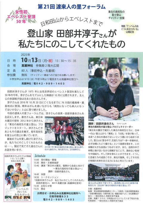 今回の渡来人の里フォーラムは、世界女性初エベレスト登頂者の田部井淳子さんのご長男・田部井進也さんをお迎えして講演いただきます。また、恒例の高麗文康高麗神社宮司とのトークセッションも。