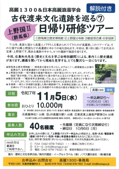 7:10 高麗神社発/7:30 高麗川駅発/8:00 坂戸駅南口発⇒(関越道)⇒9:20 群馬県立歴史博物館(右島和夫先生の直前学習会あり)⇒ 11:30 上野国分寺跡・上野国分寺館⇒(昼食・食亭つかさ)⇒13:45 高崎市観音塚厚意子資料館・観音塚古墳⇒15:30 多胡碑記念館・多胡碑⇒(関越道)⇒17:35 坂戸駅南口着 / 18:05高麗川駅着/18:15 高麗神社着 ※時間は目安です