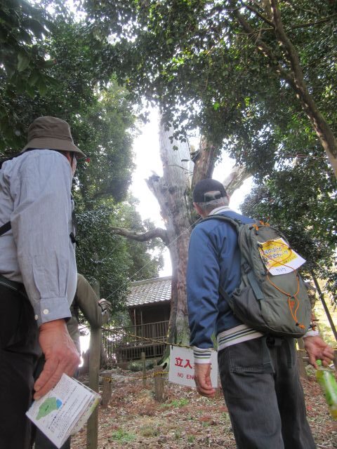 今回は、坂戸市内の遺跡と隣接する鳩山町の遺跡を巡りました。まずは、1.3キロほど西へ歩き土屋神社へ。到着すると、加藤先生が、おもに3点について解説してくださいました。公園の一角にある「万葉歌碑」。万葉集に歌われている「浅羽野」の場所と考えられていることから建てられました。土屋神社は、直径50mほどある円墳の上に社殿を構えた神社で、御神体は古墳の石室に納められています。さらに古墳上の社殿裏手には樹齢1,000年を超える神木スギがあり、埼玉県の天然記念物に指定されています。