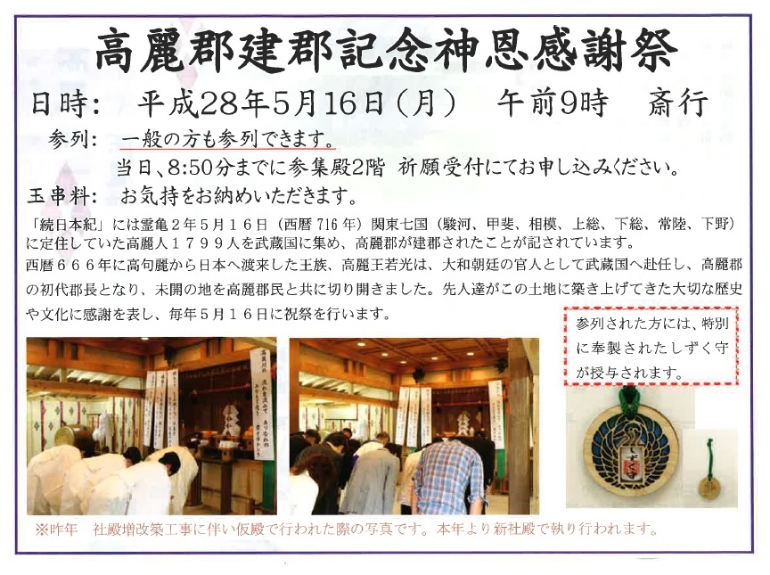 【お知らせ】高麗郡建郡記念神恩感謝祭を行います 2016/05/01 来る、5月16日(月)は、建郡記念日です。 高麗郡は霊亀2年(西暦716年)5月16日に建郡されました。 先人たちが築きあげてきた大切な歴史や文化への感謝の思いを表す「祝祭」を高麗神社において行います。 高麗郡建郡記念神恩感謝祭 一般の方も参列できますので、1300年の記念のこのときに是非、お集まりください。 ★場所: 日高市 高麗神社 ★日時: 平成28年 5月16日(月) 午前9時 斎行 当日、8時50分までに、参集殿2階の祈願受付にてお申し込みください。 また、混みあうことになるかと思いますので、お早めにお越しください。 ★玉串料: お気持ちで